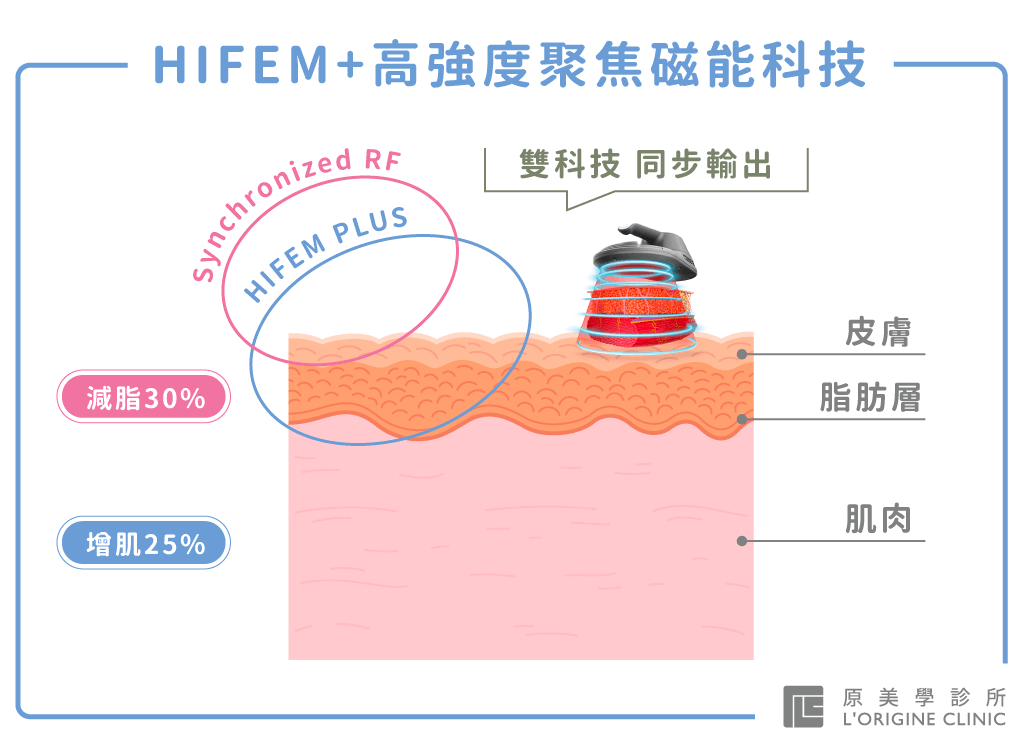 由於 EMSCULPT NEO 具有 HIFEM 高頻聚焦磁能科技,一次療程能達到約仰臥起坐  20,000 次的效果,再搭載 RF 減脂電波,熱能再加上高頻聚焦磁能科技,不但能夠透過熱能預熱治療區域,更能夠提升 HIFEM 技術的表現,達到破壞脂肪細胞、肌肉大幅度增生,只需要 4 次療程就可以看見卓越效果,更可以搭配 EMBODY 增加治療強度與後續維持。
