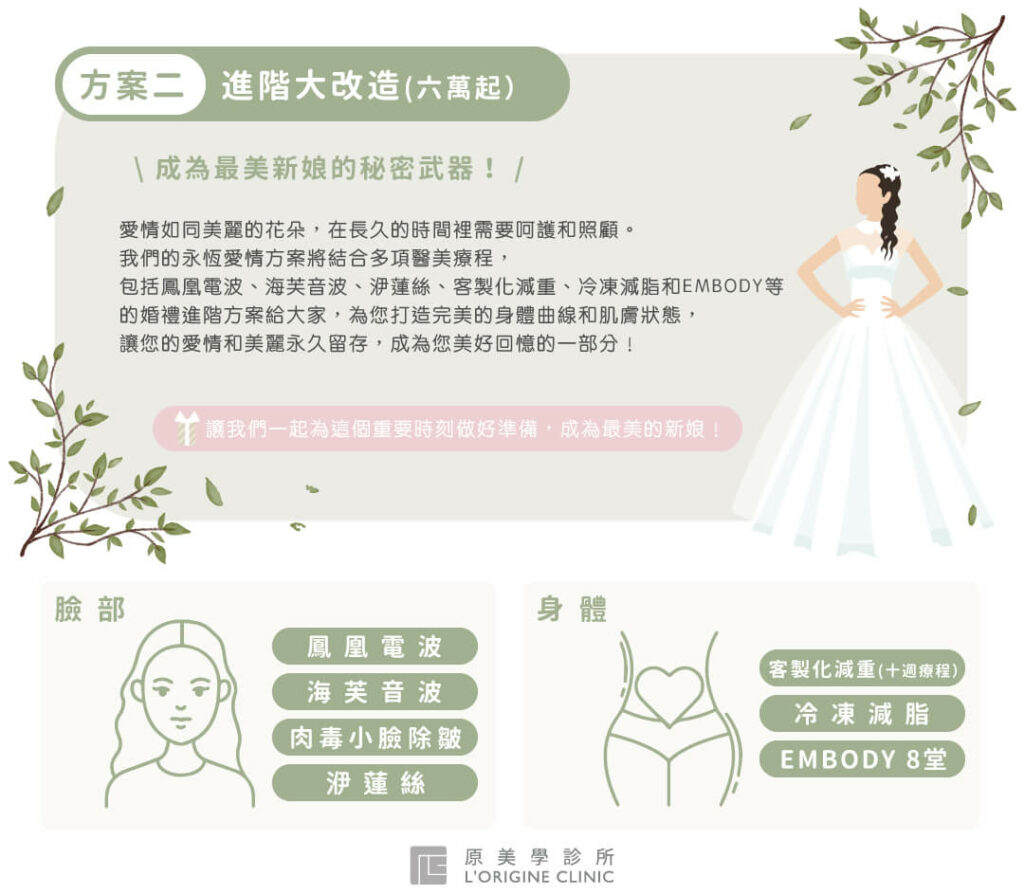 這套組合包括多個項目,例如臉部拉提、消除局部脂肪、微整形、增肌減脂等等,可以讓您擁有完美的婚禮身形。