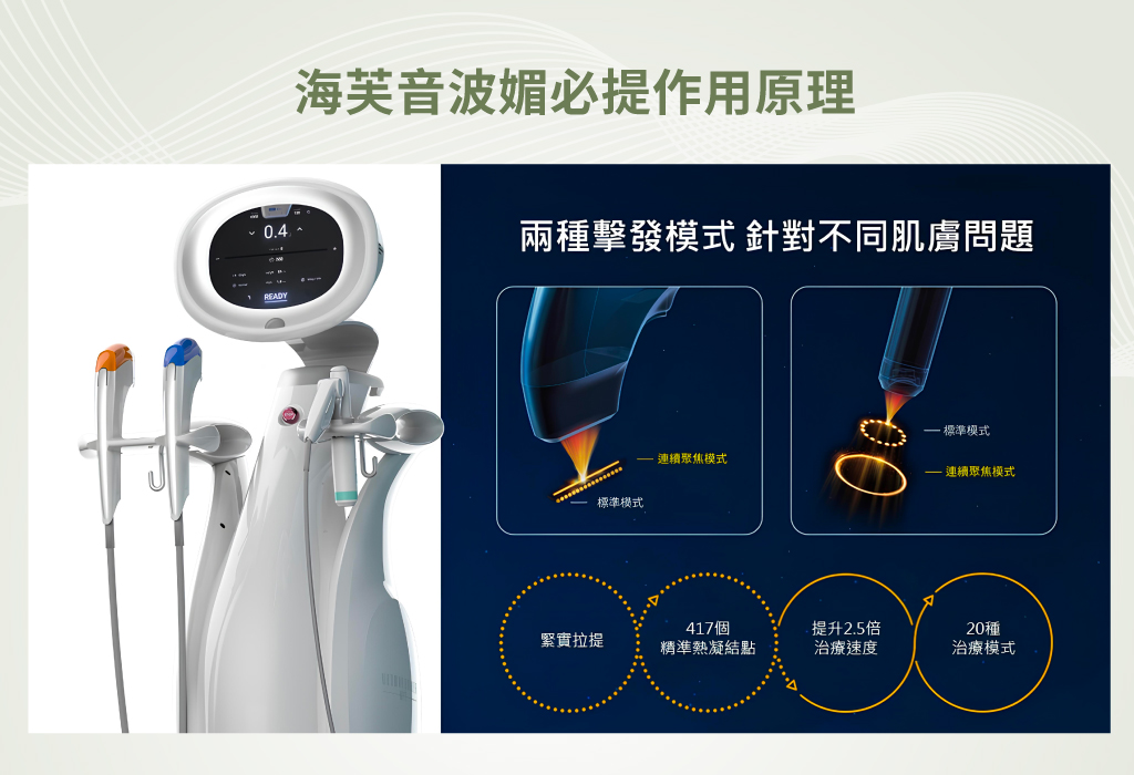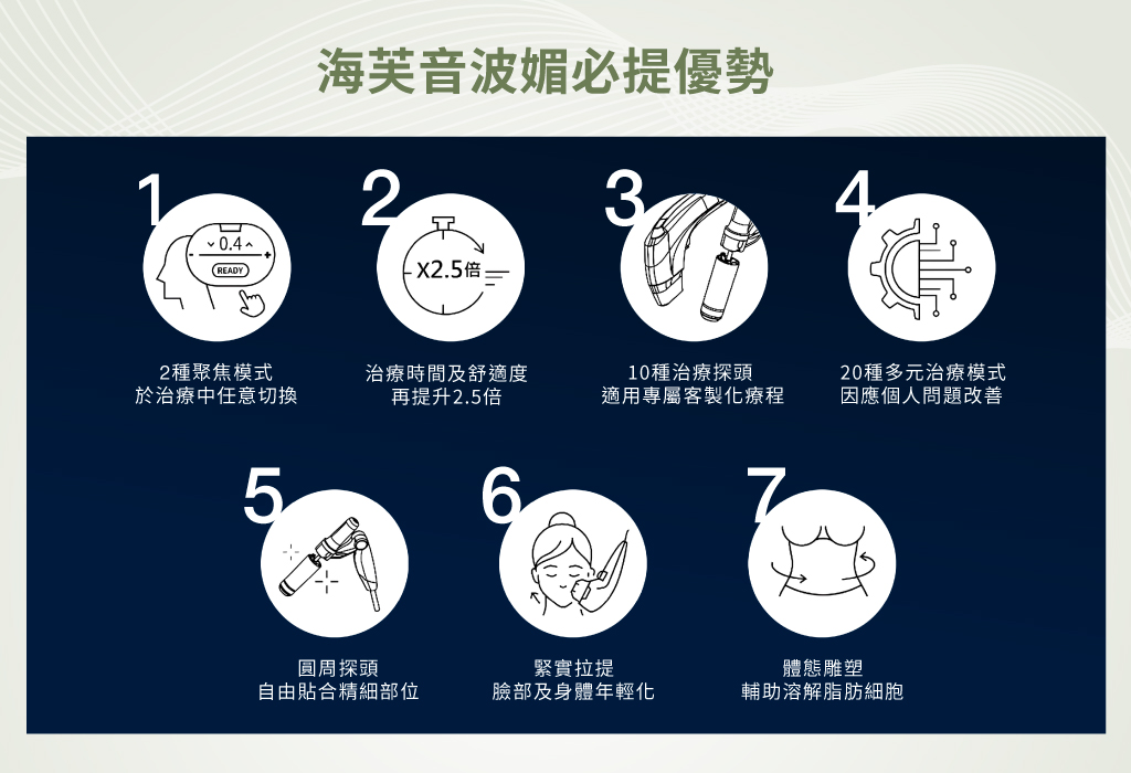 海芙音波媚必提為聚焦式超音波的治療原理,能夠在指定層次上累積熱能,並帶動下方皮膚組織的受熱,達到容積式加熱的治療作用,有效實現臉部眉毛、頦下(雙下巴)拉提,改善雙頰、下腹及大腿的皮膚緊實,以及消除腹部腰圍平均約2公分的效果。