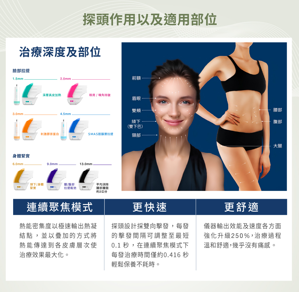 - 10 款探頭、雙模式切換:探頭具備標準模式與微脈衝模式,醫師可依臉部老化類型與部位需求調整模式,規劃更貼合個人狀況的治療流程。