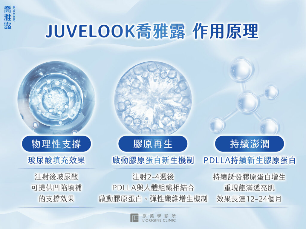 Juvelook喬雅露是透過注射聚雙旋乳酸PDLLA微粒,與傳統的玻尿酸填充原理不同,Juvelook喬雅露會誘發人體產生自己的膠原蛋白,效果會比起單純填充針劑更加自然,維持時間也較長。