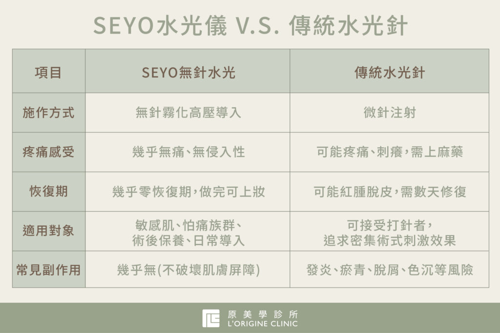 與傳統水光針需以注射方式導入不同,SEYO 完全無針、無痛、無恢復期,不會造成泛紅或腫脹,非常適合敏感肌與想要快速保養的現代人。